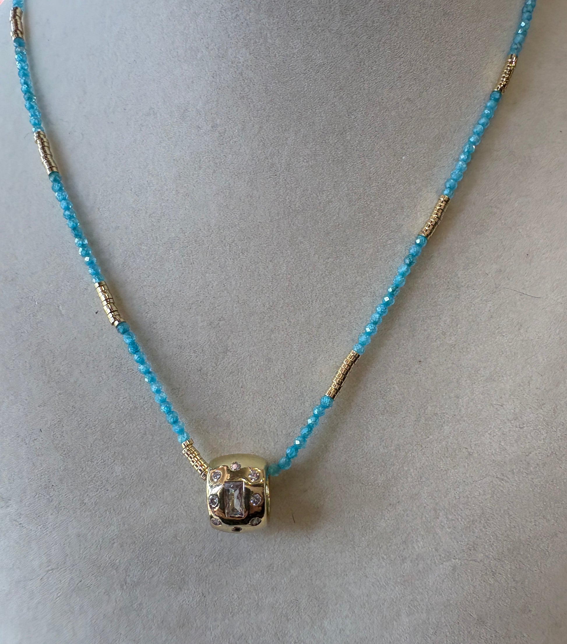 Turquoise and gold beaded necklace with a gold removable slider.16" plus 2"