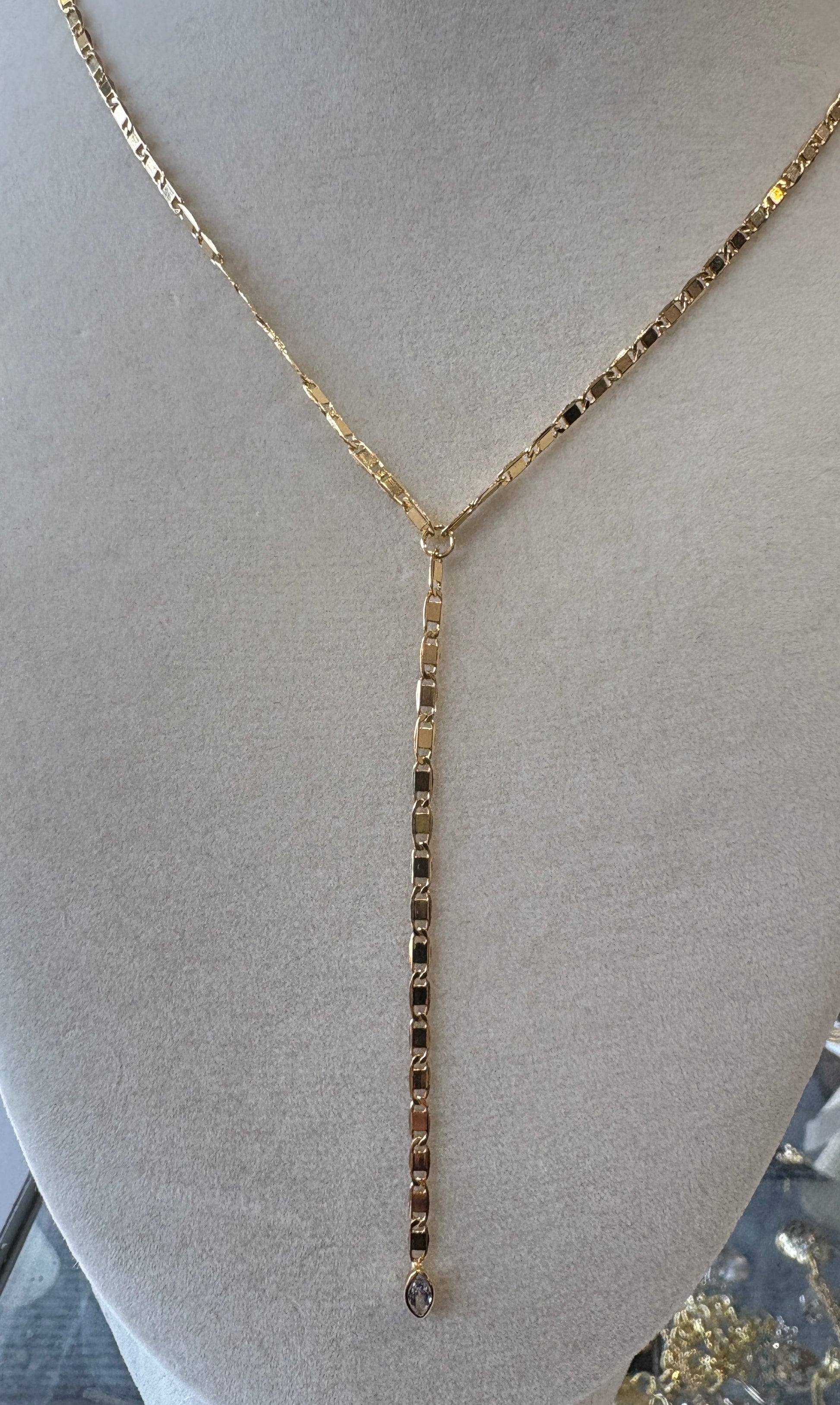 Gold-filled lariat. Length is 17" plus " drop with tiny cz teardrop on bottom. Perfect for everyday or when you need something simple for a dressy occassion.