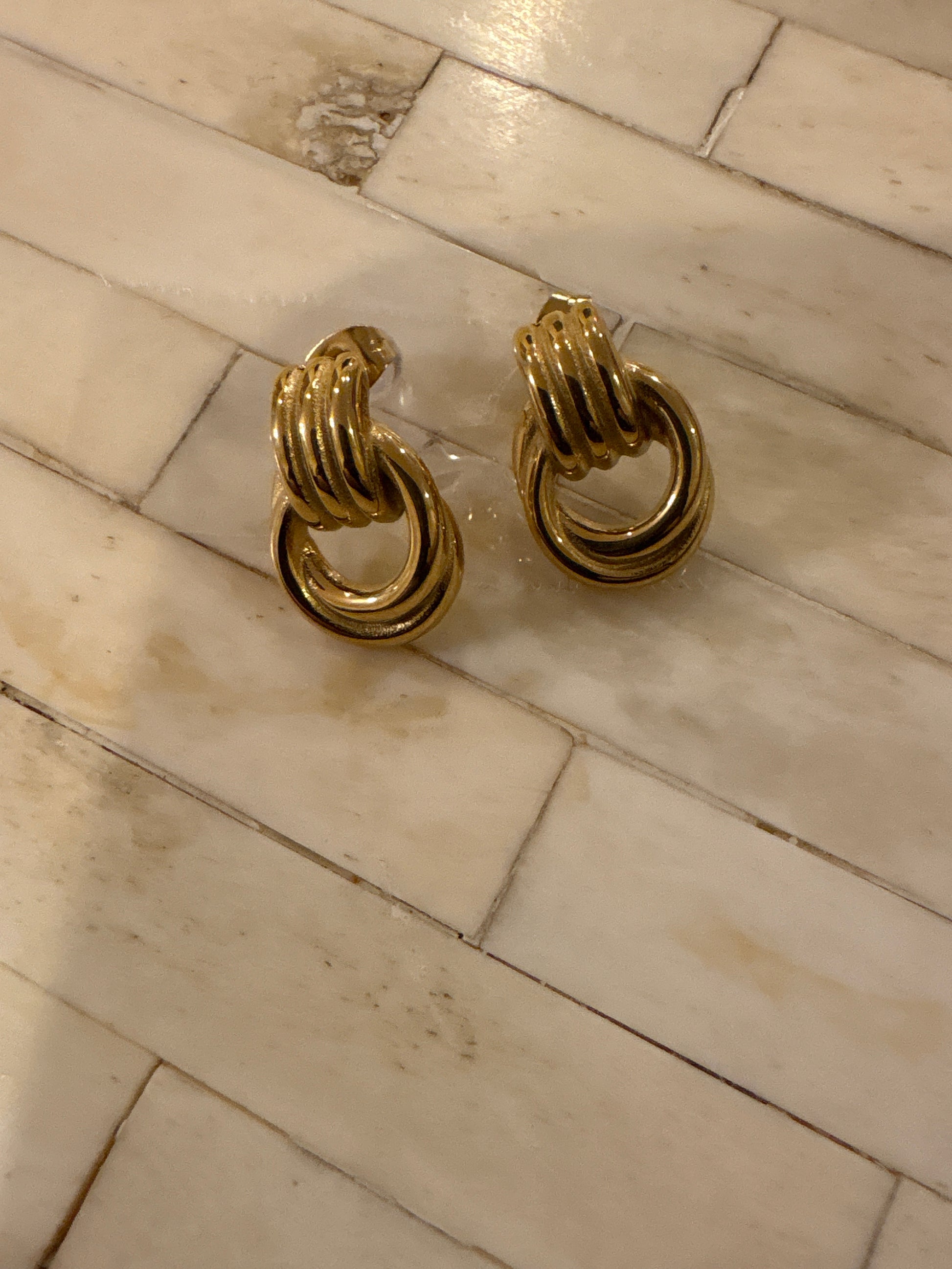 Brass knot earring. The most popular earring of the season. Measures 3/4". Lightweight .