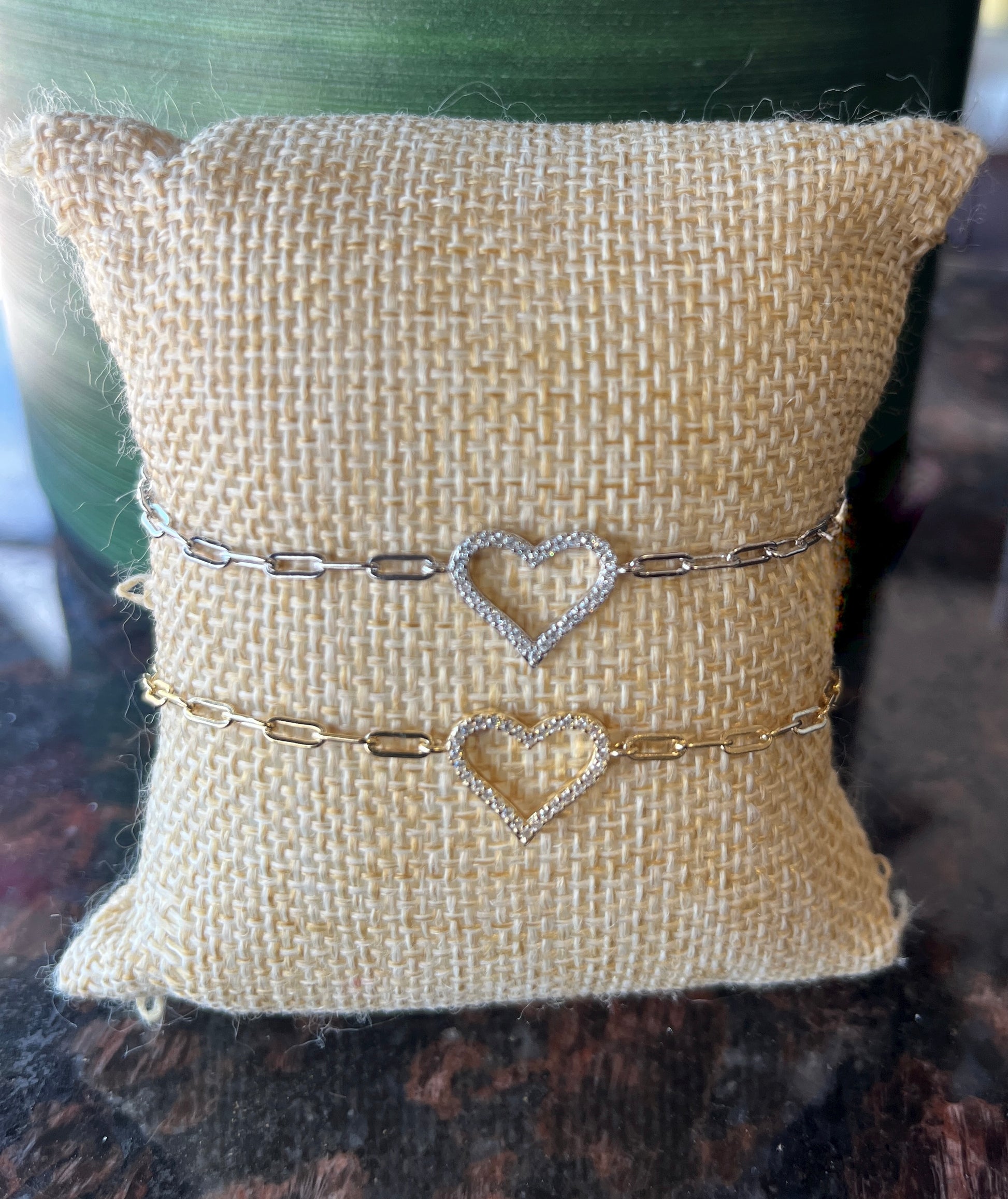 Sterling-silver paper clip bracelet .Adjustable 7" to 8" but can link anywhere on chain. Attached heart measures .5". Available in gold or silver.