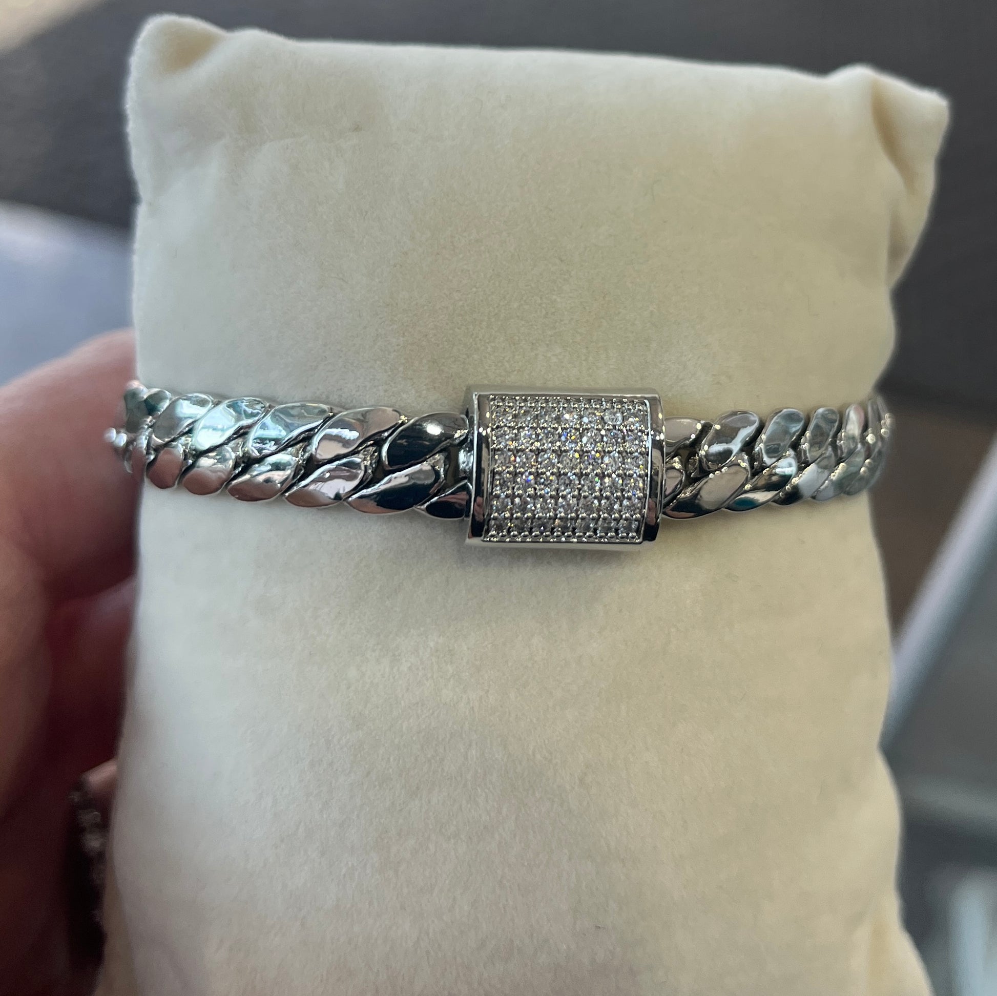 Magnetic. Fits wrists up to 7 1/4". Easy to close and open.